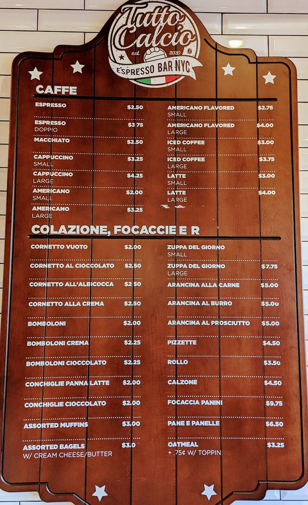 Tutto Calcio Espresso Bar offers amenities such as Takeout, Delivery, Wheelchair Accessible, Street Parking, Upscale, Catering, Accepts Contactless Payments, Takeout, Delivery, Wheelchair Accessible, ensuring a comfortable and convenient experience for clients.